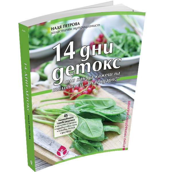 В книгата „14 дни детокс“ ще намериш информация за алкално-киселинния баланс на храните, гликемичния индекс, с какво всеки един витамин и минерал е полезен за организма, кои са най-мощните антиоксиданти, на кои храни да наблегнеш по време на режима, кои да избягваш и кои да намалиш, както и много друга полезна информация. В книгата са включени и 45 пълноцветни сурови рецепти, които ще ти помогнат да минеш през режима детокс по-лесно и без излишен глад… Проблемът с повечето диети, е че не се взимат под внимание токсичните отпадъци акумулирали се в телата ни през годините и складирани под формата на мазнини. Когато започнеш диета, чиято цел е само отслабване, мастните натрупвания се освобождават и започват да циркулират из кръвта и тялото, причинявайки невъобразими щети. Но тъй като организмът е перфектно работеща машина, която винаги се стреми към здраве и баланс, той започва да възпрепятства процеса на отслабване, за да държи токсините под контрол. Затова правилният подход към загубата на тегло не е диета, а детоксикация на организма, защото след като се отърве от вредните токсини и химикали, тялото ти ще започне да работи заедно с теб за постигане на желаните цели и ще спре да генерира нови мастни депа. Разчитайки на знанията, които получих като холистичен нутриционист, аз ги комбинирах с доказани здравословни режими като суровоядството, безглутеновите диети, соковия режим и други, които старателно изучавах и тествах през последните години, благодарение на което разработих уникален начин за пречистване на организма.
