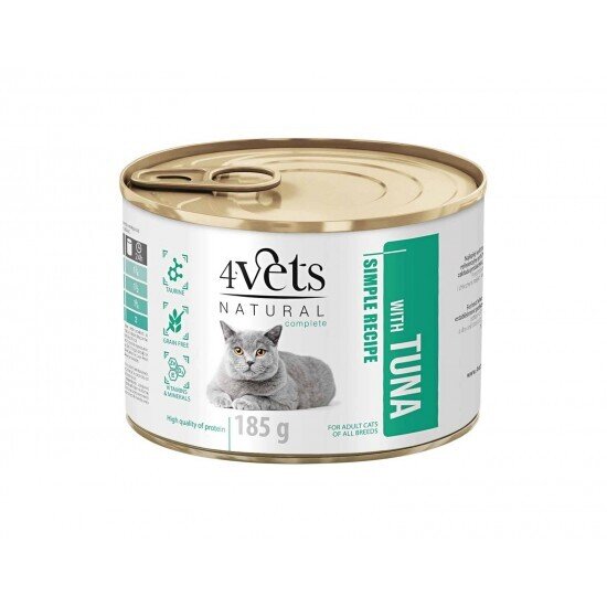 4Vets Natural Sterilized е храна за кастрирани котки с риба тон. Тя е вкусно месно ястие, което осигурява на вашата котка основни съставки и витамини и отговаря на изискванията за хранителните вещества на възрастни котки от всички породи. Съдържа висок дял месо и животински продукти, както и риба и рибни продукти, включително истински деликатес - риба тон! Храната за домашни любимци е разработена, за да отговори на специфичните нужди на котки, които са кастрирани и следователно имат повишена склонност към наддаване на тегло. Съдържанието на мазнини е намалено и е добавен таурин, който играе ключова роля в диетата на котките и има антиоксидантен и антиейджинг ефект. Продуктът е подготвен от специалисти по хранене на животните и не съдържа добавени зърнени храни, консерванти или оцветители. Това го прави изключително апетитен.