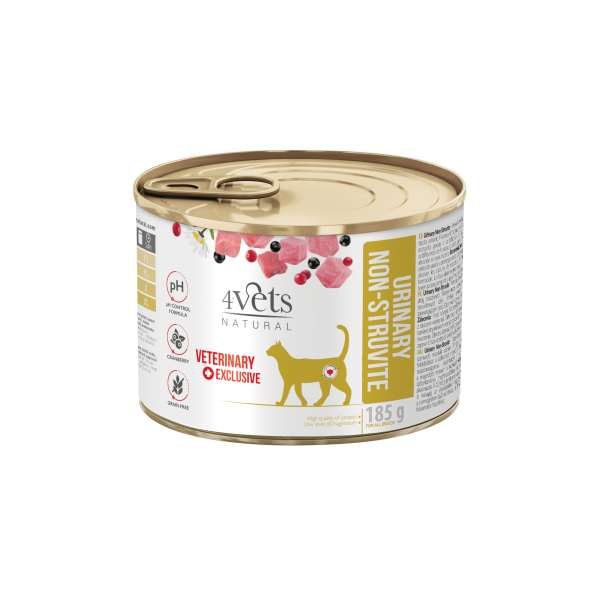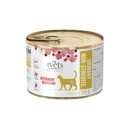 4Vets Natural Urinary е храна за котки със заболявания на пикочните пътища. Тя подпомага лечението на възпаление на пикочния мехур и разтварянето на струвитни кристали благодарение на пониженото съдържание на магнезий и протеин в нея. Диетата може да е част от профилактиката след отшумяване на заболяването.