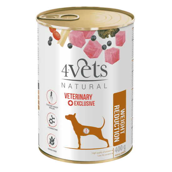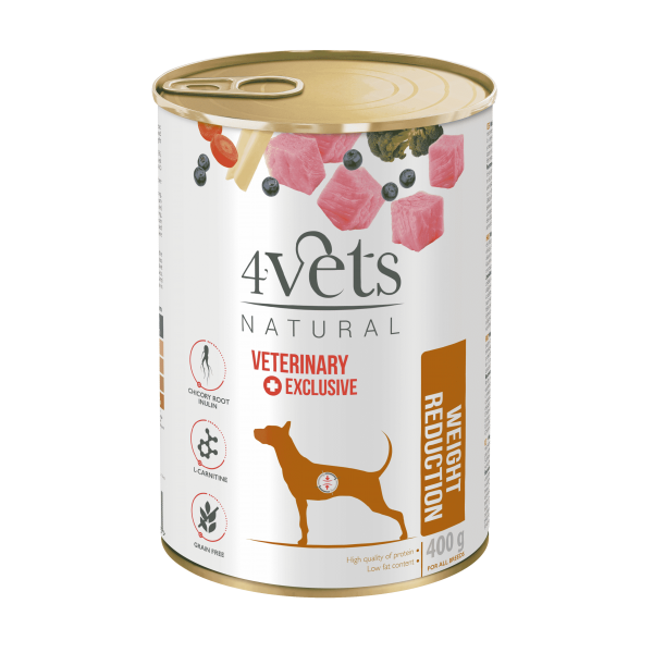 4Vets Natural Weight Reduction е пълноценна диетична храна за домашни любимци, препоръчвана за кучета с наднормено тегло и затлъстяване, с потвърден диабет и след стерилизация, за да се предотврати развитието на наднормено тегло и затлъстяване. Благодарение на ниското съдържание на мазнини и L-карнитин, диетата подпомага процеса на отслабване. Повишеното количество фибри облекчава чувството на глад.