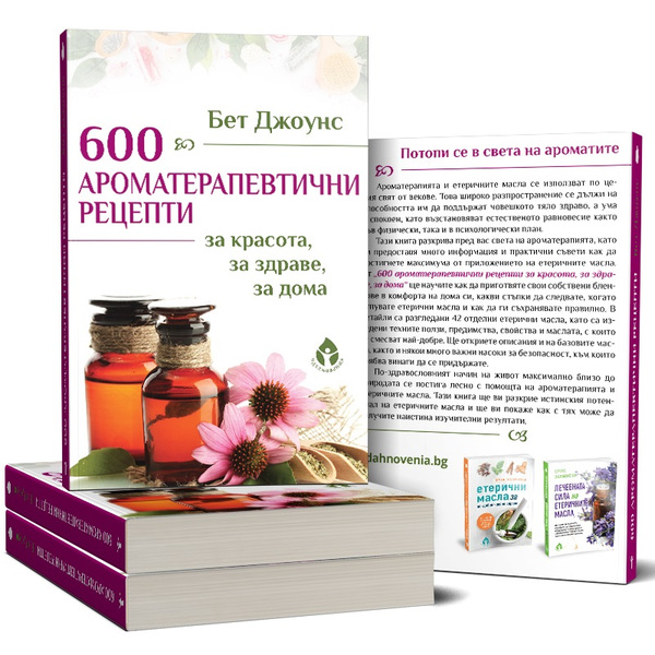 В нея ще откриеш цели 600 бързи ароматерапевтични лесни за приготвяне и невероятно ефективни рецепти. Те са разделени в три части - за красота, за здраве и за дома. Ароматерапията и етеричните масла се използват по целия свят от векове. Това широко разпространение се дължи на способността им да поддържат човешкото тяло здраво. А ума – спокоен, като възстановяват естественото равновесие както във физически, така и в психологически план. Тази книга разкрива пред вас света на ароматерапията. И ви предоставя много информация и практични съвети как да постигнете максимума от приложението на етеричните масла. От „600 ароматерапевтични рецепти за красота, за здраве, за дома“ ще научите: как да приготвяте свои собствени блендове в комфорта на дома си, какви стъпки да следвате, когато купувате етерични масла и как да ги съхранявате правилно. В детайли са разгледани 42 отделни етерични масла, като са изведени техните ползи, предимства, свойства и маслата, с които се смесват най-добре. Ще откриете описания и на базовите масла, както и някои много важни насоки за безопасност, към които трябва винаги да се придържате. По-здравословният начин на живот максимално близо до природата се постига лесно с помощта на ароматерапията и етеричните масла. Тази книга ще ви разкрие истинския потенциал на етеричните масла и ще ви покаже как с тях може да постигнете наистина изумителни резултати. Повече за книгата можеш да прочетеш тук Поръчай сега + ПОДАРЪК към всяка поръча в магазина! Уникален биоразградим молив със семена, който можеш да посадиш, след като го изпишеш.
