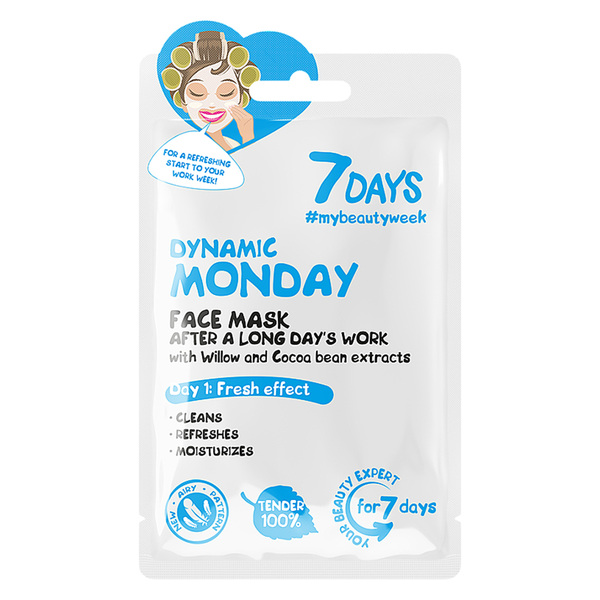 7 DAYS\n\n\n\nМАСКА ЗА ЛИЦЕ DYNAMIC MONDAY\n\n\n\nМаската в понеделник е първата стъпка в пътуването, за да получите перфектния тен.\n\nЕкстрактът от върба нежно почиства кожата, изравнява и минимизира порите.\n\nХиалуроновата киселина и уникалният хидратиращ комплекс дават тласък на еластичността на кожата.\n\nКакаовите зърна съдържат много съединения, предназначени да омекотяват и подхранят кожата.\n\nПодходяща за всеки тип кожа.\n\n\n\nНачин на употреба:\n\n\n\nНанесете маската върху почистена кожа за около 10-15 минути и след това изплакнете лицето си с вода.За значително подобряване на състоянието на кожата се препоръчва да се използва цялата гама от маски „7DAYS“ за една седмица.\n\nМаската е за еднократна употреба.