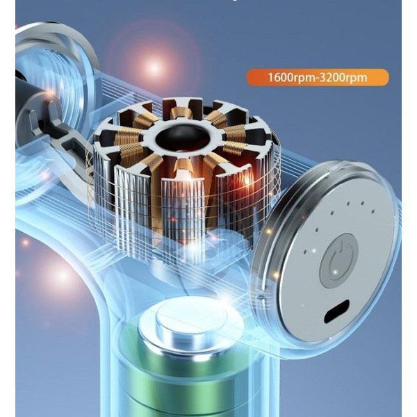 Мускулно проникване в дълбочина до 5 mm, Мощност : 24 W Max, акумулаторна батерия 2400 mah (включен кабел за зареждане), 6 скорости (1600rpm – 3200rpm), 4 сменяеми глави за широко приложение. Автономия до 40′ (при ниска интензивност). Общи размери: 12 x 16 x 4 см. Дължина на дръжката: 9 см.