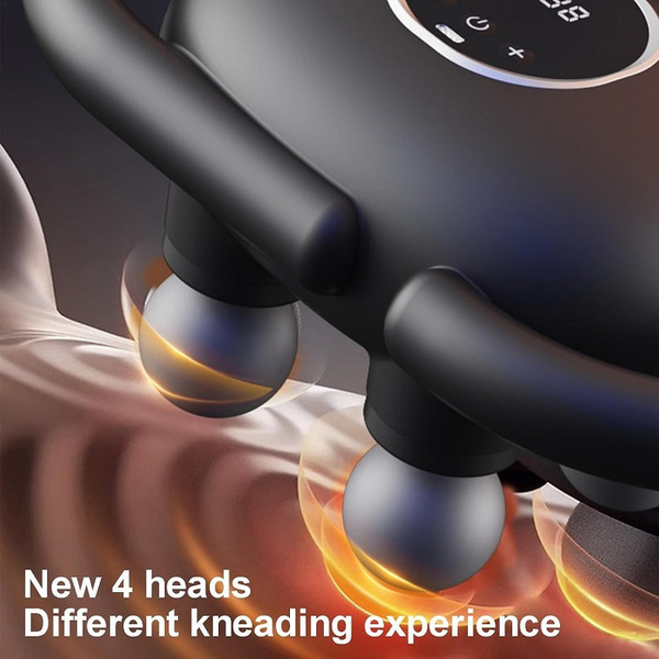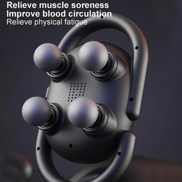Революционен уред за фасциален масаж и мускулна релаксация с 4 вибриращи глави-топки от еластичен материал и две дръжки за удобно използване.