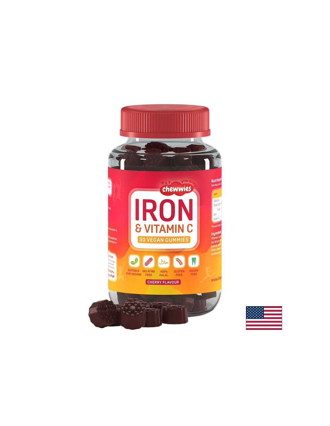 Iron with Vitamin C Chewwies е чудесно решение за хора не желаещи или изпитващи затруднение да приемат капсули или таблетки. Лесните за прием желирани таблетки са с приятен вкус на череша. Всяка желирана таблетка съдържа 5 mg железен сулфат и 40 mg витамин С (L-аскорбинова киселина) за силна имунна система, оптимални когнитивни функции и образуването на хемоглобин и червени кръвни телца.