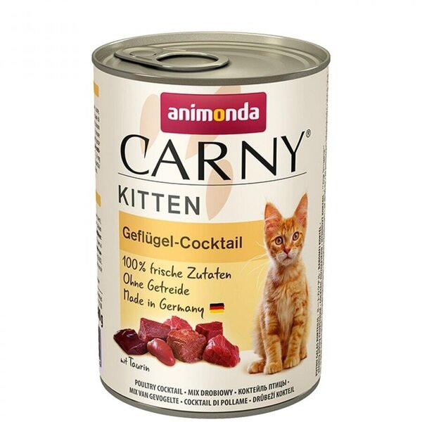 Консервите Animonda Carny ® Kitten съдържат чудесно прясно месо, което може да изкуши всяко котенце. Предназначени са за мъркащи красавци до 12 месеца и включват специална селекция от прясно месо, както при всяка серия Animonda Carny ®. Минералното съдържание и размерът на храната са съобразени с възрастта на котката. Типичната структура на месото е напълно запазена и това може ясно да се види. А вкусът е истински и неповторим, което котките ценят повече от всичко. Чистото месо прави най-доброто впечатление особенно на вашата котка. Вие можете да видите, че котката подушва и вкусва разликата! Animonda – Голямото име на деликатесна храна за домашни любимци За много хора домашните любимци са част от семейството със статус на най-добър приятел. В продължение на три поколения компанията Stockmeyer Verwaltung AG израства до един от водещите немски производители на висококачествено месо и месни деликатеси за хора. Част от този концерн е и Animonda GmbH., която има за цел благополучието на нашите домашни любимци, като насочва своите проучвания, производство и маркетинг към висококачествените храни за котки и кучета. Продуктът е специално създаден от любители на животните, за които качеството на живот и добруването на домашните любимци е от изключително значение. Затова те са създали рецепти, с които да осигурят на своите любимци качествено хранене, като част от качественото съществуване. Жизненост и здраве от купата за хранене Всички продукти са създадени в съответствие с най-новите научни открития, засягащи здравето и чувствителността на животните. Затова са натурални, свежи и без абсолютно никакви неразрешени оцветители. Подбраните свежи съставки се подготвят толкова внимателно, че техните жизнени съставки остават почти непроменени. Гарантираме, че надписът върху опаковката наистина отговаря на съдържанието. В разнообразната и добре балансирана програма на хранене на Animonda  продуктите са така създадени, че да отговарят на специфичните изисквания на животните - възраст, тегло, активност, както и специални изисквания или обстоятелства като алергии, непоносимости или метаболични проблеми. Освен това сме развили и специални диети за домашни животни, страдащи от специфични проблеми. Експерти по храната за домашни любимци ежедневно проверяват качеството. Процесът на производство е сертифициран съгласно стандарта за качество ISO 9001. Постоянно е под вътрешен и външен контрол и подлежи на внимателно научно наблюдение. В развитието на продуктите ветеринарите и експертите по хранене в Animonda си взаимодействат с водещи немски и европейски университети. Също така голям принос имат и развъдниците, любителите на домашни животни и широкото ноухау в производството на хранителни продукти.