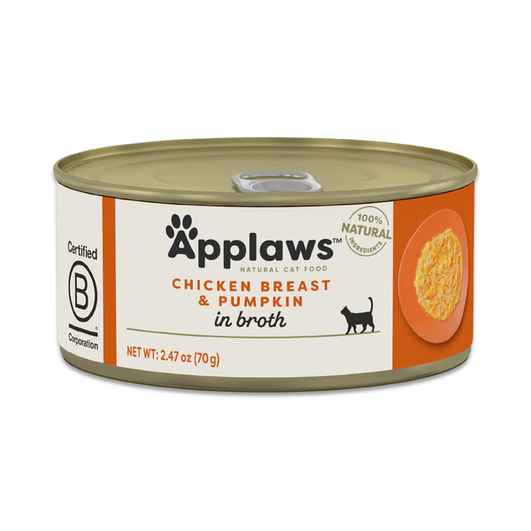 Applaws премиум влажна храна за котки - 100% натурална допълваща храна за котки без изкуствени консерванти, оцветители или аромати. Не съдържа нищо повече от изброените съставки: Пилешки гърди 50%, Пилешки бульон 25%, Тиква 24%, Ориз 1%. Без добавени оцветители, овкусители и консерванти! 100% НАТУРАЛНА храна   Изключително ВКУСНА и ЖЕЛАНА от животните   Хипоалергична   Подходяща за: капризни и чувствителни животни любимци склонни към алергии Предимства: изгражда здрава кожа и блестяща козина спира образуването на зъбен камък и лош дъх предотвратява и облекчава ставните проблеми стимулира натрупването на мускулна маса и изгарянето на мазнините. Applaws използва само най-висококачествени съставки, подходящи за хора, предоставяйки на вашата котка истинско вкусово изживяване. За мократа храна за котки Applaws се използват само 100% натурални съставки  с най-високо качество. Натурални съставкиСъставките, използвани в мократа храна Applaws, са добити по най-високите етични стандарти. Висококачествени протеиниМократа храна Applaws осигурява висококачествени протеини, които са важни за поддържането на мускулите. Високо съдържание на влагаВисокото съдържание на влага в мократа храна Applaws помага на вашата котка да остане хидратирана. Източник на Омега-3 и -6.Тези мастни киселини спомагат за еластична кожа и красива козина. Месото или рибата са богати на протеини и осигуряват много омега-3 и омега-6 мастни киселини . Не се добавят никакви други вещества, което означава, че няма скрити оцветители, ароматизатори или добавки. Ще видите разликата в момента, в който отворите консервата: естествената консистенция на тази  безглутенова  храна ще ви зарадва, а вашите котки ще я харесат!