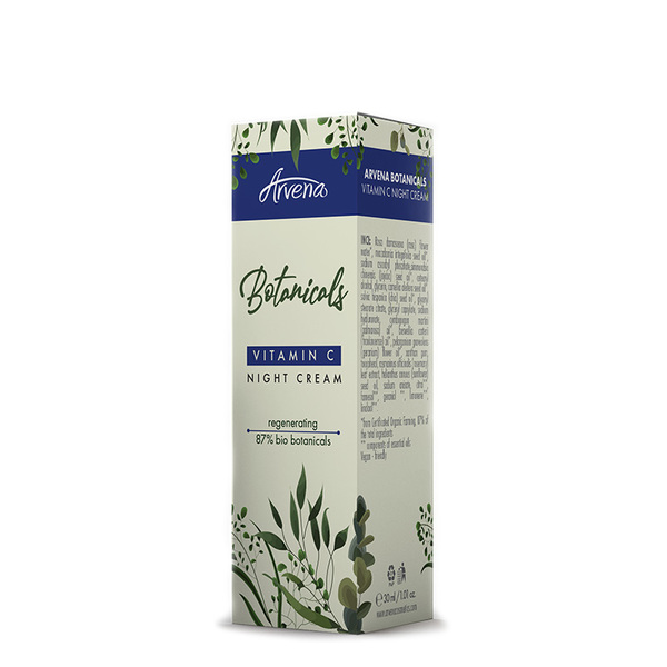 Био маслата от чия, камелия и жожоба подпомагат ефективно процесите на нощна регенерация, действат противовъзпалително и се грижат за поддържане на бляскава кожа. Активната съставка витамин С стимулира производството на колаген, изсветлява тена и предпазва кожата от оксидативен стрес. Натуралната хиалуронова киселина осигурява дълбока хидратация и изглажда фините бръчки.