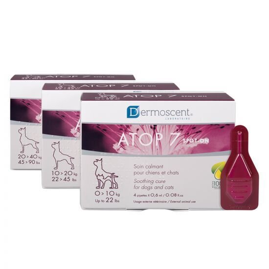 Изработен от натурални успокояващи съставки, ATOP® spot-on е специално формулиран за:-Раздразнена или склонна към алергии кожа-Склонна към сърбеж кожа-Възпаления, зачервявания-СвръхчувствителностЛипиден комплекс, извлечен от масло от пшенично и конопено семе, богато на Омега 3 и 6, ФитосерамидиСинергичен комплекс от етерични маслаПРЕДИМСТВАATOP® spot-on е първият спот он, съдържаш изключително само натурални съставки, койтоподпомага възстановяването на кожната бариера и успокоява раздразнената кожа.ПОДХОДЯЩО ЛИ Е ЗА МОЯ ЛЮБИМЕЦ?Раздразнена кожа, склонна към сърбеж: ATOP 7® spot-on е практичен отговор за успокояване и укрепване на кожата в допълнение към медикаментозното лечение. Между епизодите: редовната и непрекъсната употреба помага да се насърчи възстановяването на кожната бариера за по-добра естествена защита на кожата.КАКВО СЪДЪРЖА?Овлажняващо конопено масло, богато на незаменими мастни киселини (Омега 3 и 6),незаменими за вашите животни, но които те самите не могат да синтезират.Липиден комплекс, извлечен от пшенични зърна, богати на серамиди, както и на незаменими мастни киселини.Синергичен комплекс от перфектно дозирани етерични масла, богати на куркума, галутерия и екстракт от дърво Кандея с успокояващи свойства. Фито биодифузен агент позволява дифузията на съставките върху цялото тяло на животното от 1 точка на приложение благодарение на себума, естествено присъстващ на кожата.УПЪТВАНЕ ЗА УПОТРЕБА1 пипета на седмица докато е необходимоМасажиране не е необходимо. Ефективният биодифузен агент позволява равномерно разпределение на продукта върху цялото тяло на животното от една точка на приложение.Препоръчва се да не се къпе животното 2 дни преди и 2 дни след приложението, за да се предотврати преждевременното елиминиране на себума, естествено присъстващ на повърхността на кожата на животното, преди пълната дифузия на активните съставки.Няма известно взаимодействие за комбинирана употреба с друго спот-он.За животни с дълга или много гъста козина измийте мястото 24 часа след нанасянето, за да отстраните потенциалните остатъци от продукти върху козината на животното.МНЕНИЕТО НА ВЕТЕРИНАРНИТЕ ЛЕКАРИИзползването на локални грижи за насърчаване на възстановяването на кожната бариера остава от съществено значение при мултимодалното управление на повтарящи се патологии като алергичен дерматит или атопичен дерматит.Благодарение на своите незаменими мастни киселини и фитосерамиди, ATOP7® spot-on е полезен и особено практичен отговор, който помага да се успокои и хидратира чувствителната кожа.Ветеринарно проучване* върху 28 кучета показа ползата от приложението на ATOP 7® spot-on за успокояването на кожата, предразположена към атопии.16 атопични кучета бяха третирани с ATOP 7® spot-on и ATOP 7® шампоан веднъж седмично в продължение на един месец в допълнение към медикаментозното лечение, докато 12 атопични кучета продължиха лечението си с лекарства без допълнителни грижи.Ефектите на ATOP 7® са демонстрирани в сравнение с групата без топикална грижа:Козметично подобрение **: +71%Помага за намаляване на сърбежа: -72%* Топикалната терапия със спот-он и шампоан, съдържащ есенциални мастни киселини и други естествени екстракти, повишава ефикасността на локиветмаб при кучешки атопичен дерматит и забавя пристъпите на заболяването: единно – сляпо, рандом