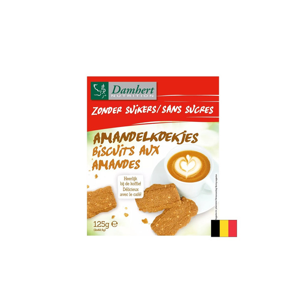 Zonder Suikers sans sucres Amandelkoekjes bisuits aux amandes / Бадемови бисквити (без захар), 125 грама е здравословен продукт, произведен от белгийската компания Damhert. Тези вкусни бадемови бисквити без добавена захар предлагат отличен баланс между хрупкава текстура и деликатен аромат на бадеми.