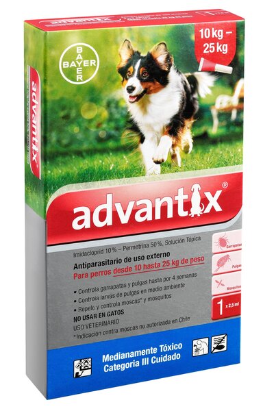 Advantix притежава силна протекция чрез отблъскване и убиване на: бълхи кърлежи пясъчни мухи, комари и кръвосмучещи мухи предотвратява бъдещо опаразитяване за 1-месец след поставянето. Лесно приложен на две места върху върху кожата (основата на косъма), в областа на врата между плешките. Препоръчително 48 часа преди или след поставяне на пипетата да не се къпе кучето с шампоан. Продуктът е приложим на кученца над 7 седмична възраст. Унищожава тези, които са върху кучето и отблъсква тези, които са в околната среда До 3-5 минути след приложението бълхите спират да хапят и умират Намалява риска от пренасянето на заболявания като лайшманиозата, ерлихиозата и дирофилариозата Ефективността се запазва ако кучето се намокри Може да се използва при бременни и лактиращи кучета Да не се използва за котки! Може да се ползва при бременност и лактация.