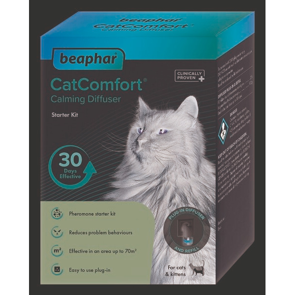 Феромоните са невидимите маркери, оставени от котките, които маркират една област като безопасно, удобно място и са често свързани с чувства на увереност и спокойствие. Оставянето на тези маркери е начин котката да формира положителна връзка с обект или дадно пространство. Серията Beaphar CatComfort® е подходяща при: → Прекомерно драскане на мебели/стени/предмети → Уриниране на определени места в къщата → Местене в нов дом → Транспортиране → Продължително мяукане → Всякакъв вид нервно поведение → Посещение при ветеринар → Нов член на семейстовто (дете/куче/коте/зайче) → Празнични фойеверки → Посещение на много хора в къщата (рожденни дни/партита)   Дифузер за директно изпаряване чрез включване в контакта: → Покрива площ до 70 кв.м. → Достатъчен за 30 дни непркъсната употреба Наличен за продажба е и резервен пълнител.   Добре дошли в Beaphar CatComfort За хората, техният дом е тяхното безопасно пространство. Мястото където те автоматично се чувстват удобно и са спокойни. Това също е изключително важно и за нашите домашни любимци. За жалост, те не могат да ни кажат кога нещо в тяхната среда ги тревожи или се чувстват нервни или неспокойни. Вместо това този дискомфорт се показва в редица начини, които могат да бъдат много обезпокоителни за собствениците на котки. Проблемното поведение, като например драскане и припикаване, може да бъде разочароващо или притеснително за собствениците на котки, в резултат на това както в котката, така и в собственика чувстват, че техният дом не е спокойното и комфортно място което би трябвало да е. Възстановете спокойствието и уютната атмосфера в дома си с гамата на Beaphar - CatComfort Range. Beaphar CatComfort използва феромони, които са познати на вашата котка, и клинично доказано насърчават чувството на увереност, което предотвратява нежелано поведение. Чрез използването на Beaphar CatComfort можете да помогнете на вашата котка да се чувства свободна от стрес. Феромоните са невидимите маркери, оставени от котките маркирайки една област като безопасно, удобно място и са често свързани с чувство на увереност и щастие. Оставянето на тези маркери е начин за котката даформира положителна връзка с обект или пространство. Много от собствениците на котки разпознаят това поведение когато котките често маркират домашното си пространство. По този начин котката ви освобождава феромони и маркиране района като "безопасно пространство", което е удобни за тях, и да ви идентифицира като човек, те са щастливи да бъдат наоколо. Как работят феромоните: Използването на феромони в Beaphar CatComfort, дава на котките индикация, че районът е "Безопасно пространство", което им помага да се чувстват по-комфортно и така се намалява проблемното поведение. Дългосрочно стресът при котките често може да доведе до клинично заболяване, така че е важно собствениците да правят всичко възможно, за да помогнат на котките си се чувстват уверени и без стрес, особено по време на време на промени като фойерверки, местене или добавянето на нов домашен любимец или член на семейството. Когато една котка се чувства удобно и уверено, те са по-малко склонни да проявяват проблемно поведение като "маркиране" или драскане.