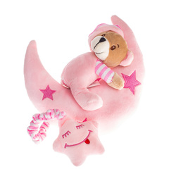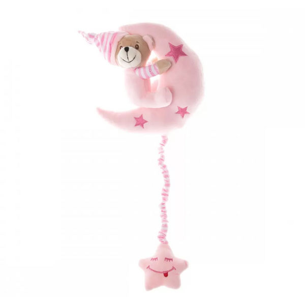 Бебешка латерна Розова луна е прекрасен аксесоар, нужен за всяко бебче.Нежната приспивна мелодия ще успокои вашето мъниче и неусетно то ще се унесе в сладък и спокоен сън.Незаменима бебешка играчка, която е напълно безопасна и може да поставите в леглото на бебето.Размер: 20 смСъстав: текстил, пълнеж и багрила безвредни за здравето, 100% полиестер.Отговаря на европейския стандарт за качество EN71.