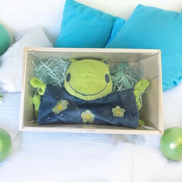 Мека играчка за гушкане жабка с надпис е прекрасен аксесоар за бебче.