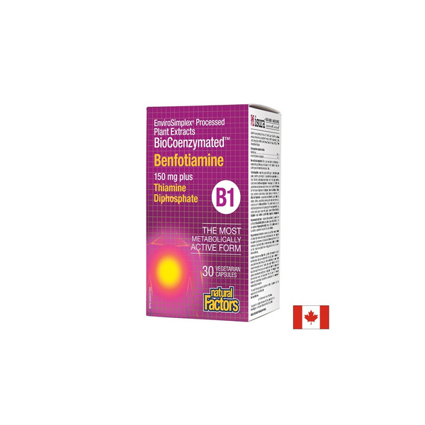 Бенфотиаминът на Natural Factors e превъзходен източник на тиамин, особено в сравнение с тиамин хидрохлорид, тъй като осигурява по-висока бионаличност на тиамин. Тази формула съчетава 150 mg бенфотиамин с 10 mg биоактивен тиамин дифосфат, за подпомагане на нервната функция и енергийния метаболизъм, заедно с Farm Fresh Factors - биоенергична смес от фитонутриенти от цели храни.