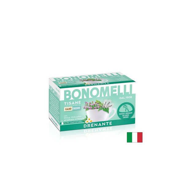 Tisane Drenante на италианската компания Bonomelli е висококачествена билкова смес, която съдържа в състава си екстракт от листата на бреза и коприва, лайка, лист ортосифон, вербена и дехидратиран ябълков сок. Има антиоксидантни, противовъзпалителни и диуретични свойства. Насърчава естествената детоксикация на организма и спомага за отвеждането на вредните вещества, токсините и излишната вода от тялото. Оказва благоприятен ефект при инфекции на пикочните пътища и бъбреците, спомага за детоксикацията на черния дроб и намалява задържането на вода. Осигурява антиоксидантна защита на клетките на тялото, допринася за контрола на кръвната захар, кръвното налягане и холестерола и спомага за подобряване усещането на лекота. Билковият чай е подходящо средство за включване в програми за детоксикация и поддържане на водния баланс.