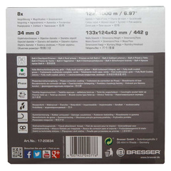 </ul><table><tbody><tr><td>Марка</td><td>Bresser GmbH, Germany</td></tr><tr><td>Гаранция</td><td>2 години</td></tr><tr><td>EAN</td><td>4007922040776</td></tr><tr><td>Размер на опаковката (Д x Ш x В)</td><td>18x18x7 cm</td></tr><tr><td>Транспортно тегло</td><td>0.82 kg</td></tr><tr><td>Тип на призмата</td><td>призма на Амичи с фазова корекция</td></tr><tr><td>Увеличение, x</td><td>8</td></tr><tr><td>Диаметър на лещата на обектива (апертура), mm</td><td>34</td></tr><tr><td>Материал на оптиката</td><td>BaK-4</td></tr><tr><td>Покритие на лещите</td><td>зелен, цялостно многослойно покритие, върхово отразяващо покритие</td></tr><tr><td>Разстояние от очите, mm</td><td>17.15</td></tr><tr><td>Коефициент на здрач</td><td>16.49</td></tr><tr><td>Относителна яркост</td><td>18.06</td></tr><tr><td>Зрително поле, °</td><td>6.97</td></tr><tr><td>Зрително поле, m/1000 m</td><td>122</td></tr><tr><td>Близък фокус, m</td><td>4</td></tr><tr><td>Регулиране на диоптъра на окуляра, диоптри</td><td>±4</td></tr><tr><td>Разстояние между окулярите, mm</td><td>56 — 76</td></tr><tr><td>Регулиране на фокуса</td><td>централно</td></tr><tr><td>Чашки на окулярите</td><td>въртящи се</td></tr><tr><td>Тяло</td><td>метален, пластмаса, гумиран</td></tr><tr><td>Пълнеж на корпуса</td><td>инертен газ</td></tr><tr><td>Водоустойчив</td><td>yes</td></tr><tr><td>Устойчивост на влага</td><td>yes</td></tr><tr><td>Клас на защита от влага/проникване на вода</td><td>потапяне на дълбочина до 1 m</td></tr><tr><td>Диапазон на работната температура, °C</td><td>-20 — 50</td></tr><tr><td>Размер</td><td>компактен</td></tr><tr><td>Приложение</td><td>туристически</td></tr><tr><td>Торбичка/калъф/чанта в комплект</td><td>торба</td></tr></tbody></table>