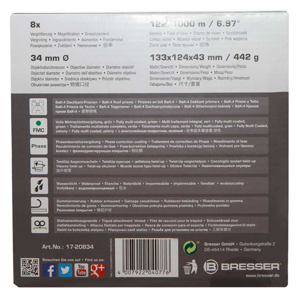 <p>The binoculars are armed with the newest phase coating and let the picture shine more clear in contrast and high-definition, reinforced by fully-multicoated. Because of BaK-4 glass material you get a bright and clear picture. Based on twist-up eyecups spectacle wearers can also enjoy the full field of view. They are adjustable in 2 steps and also support the view without glasses. The Bresser Pirsch Binoculars have a rubber armored body for solid grip. All Pirsch models are armed with a broad and very comfortable neckstrap. To make the package complete these binoculars are waterproof and nitrogen purged to prevent them against fogging.</p>