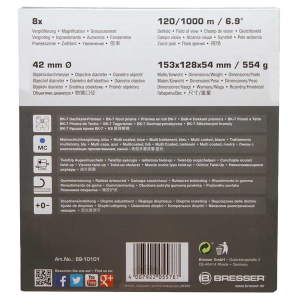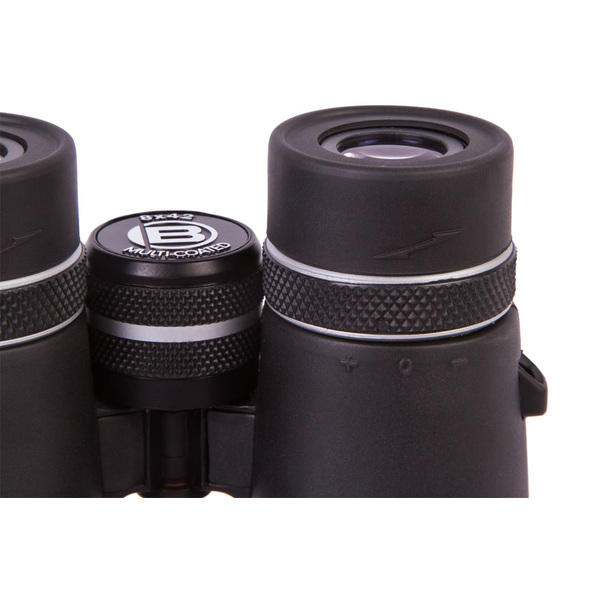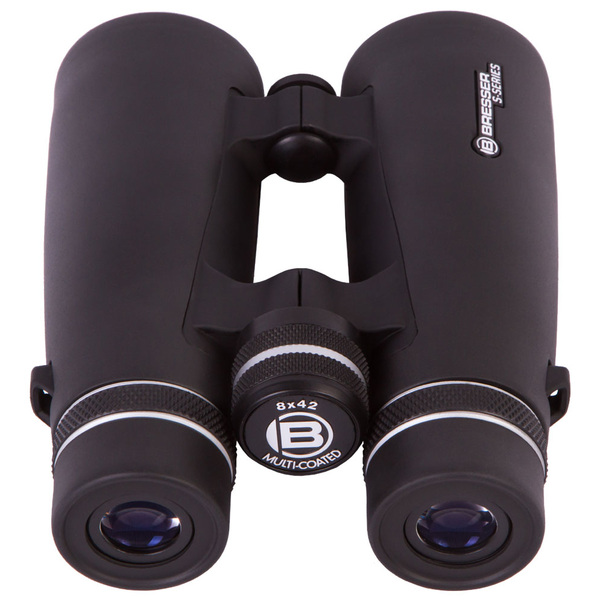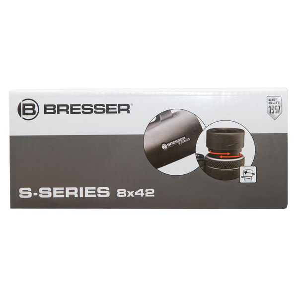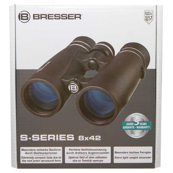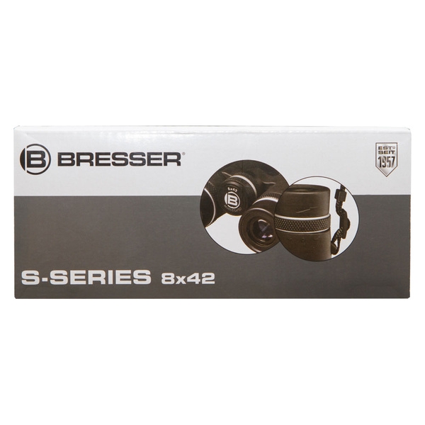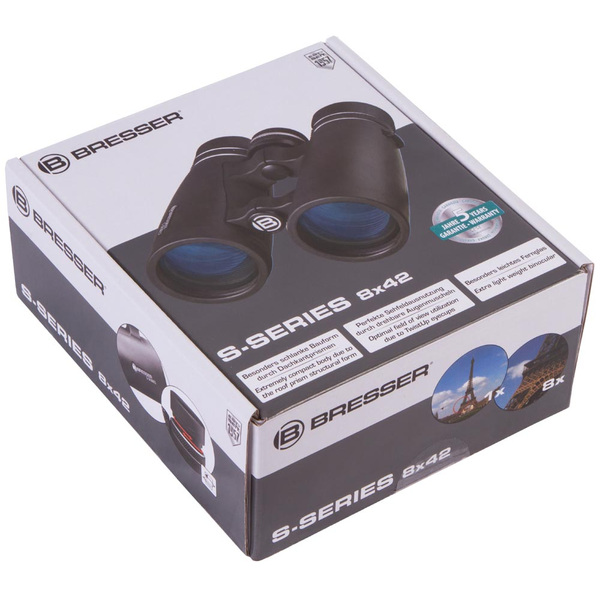 The Bresser S-Series 8x42 is a roof prism binocular with a magnification of 8x and an optical aperture of 42mm. A diopter adjustment allows diopter corrections up to +/-2. A high quality multilayer coating on all glass elements reduce distracting reflections and improves the light transmission and provides a high contrast also in bad light conditions. The binocular is build with a handy and stain resistant rubber surface. Due to the light weight body of only 554g it is easy to handle and to carry. For better transport a bag and a comfort strap is included in the delivery.