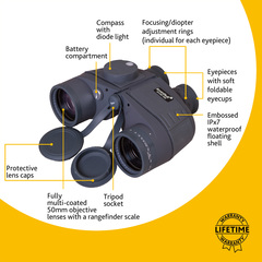 <p>Корпусът на тези най-добрите морски бинокли разполага с вграден далекомер и компас с диодна светлина. Можете да видите скалата на далекомера в окулярите и можете да измерите височината на наблюдавания обект или разстоянието до него, за да определите местоположението му. Нуждаете се от две батерии за захранване на диодната светлина. Компасът указва посоката към обекта. Стойността на делението е 1°. Север е на 360°, юг е на 180°, изток е на 90° и запад е на 270°.</p>