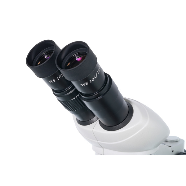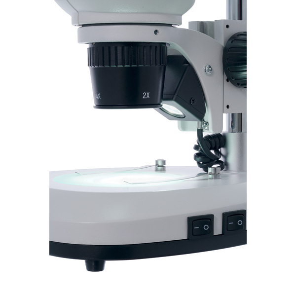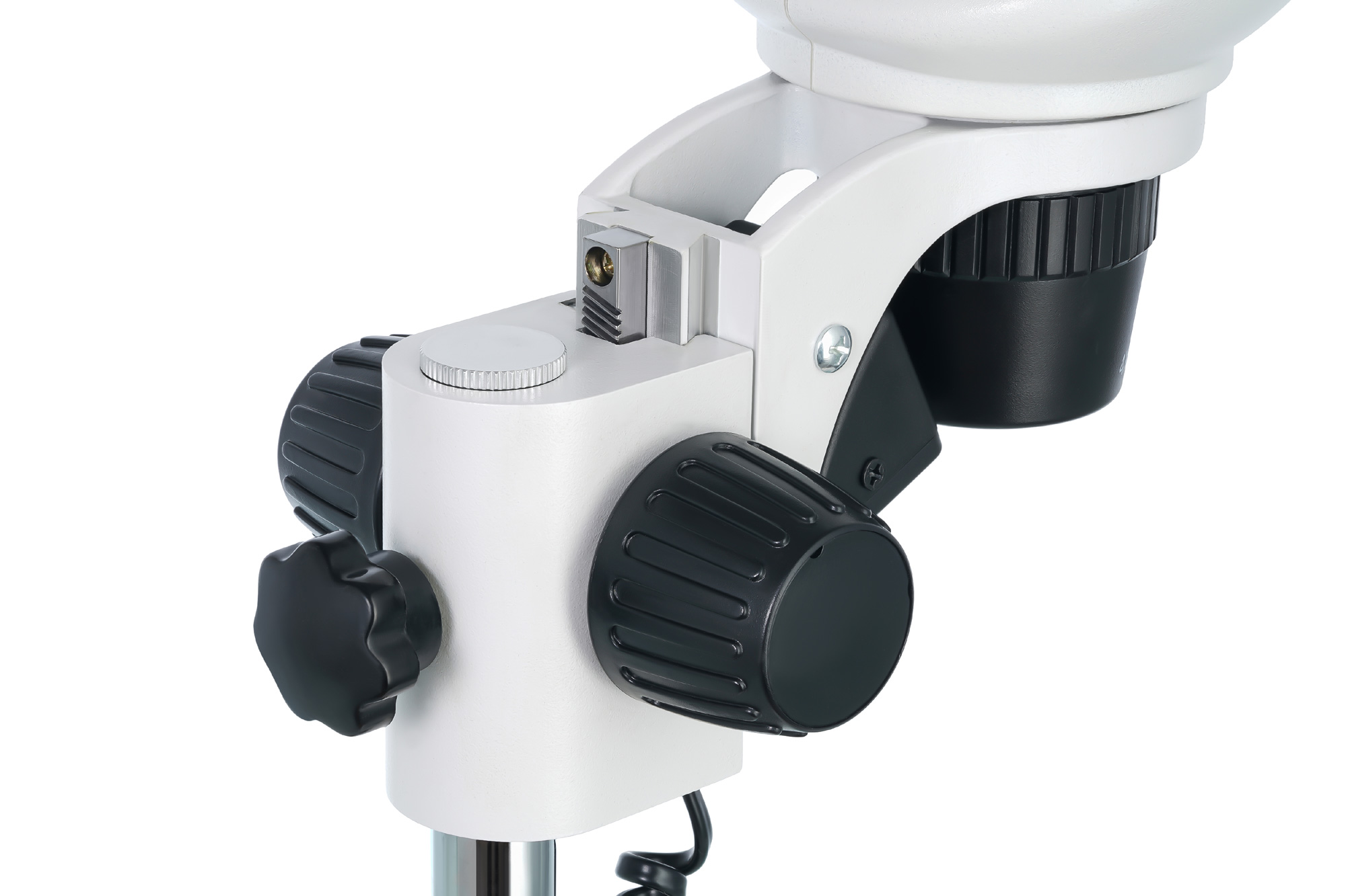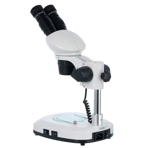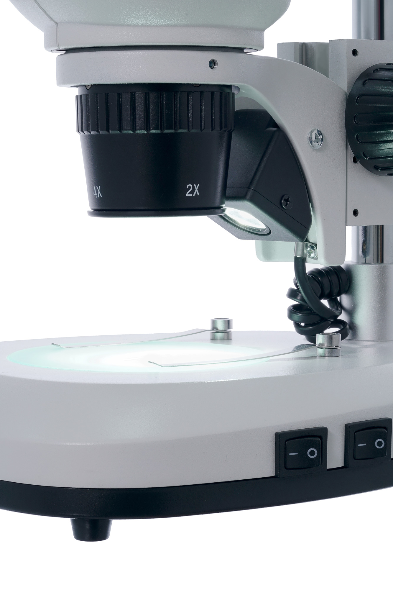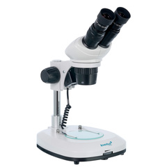 <p>Оптичните елементи на микроскопа са произведени от стъкло, обективът осигурява две увеличения: 2 и 4 пъти, широкоъгълните окуляри осигуряват 10-кратно увеличение. Диапазонът на общото увеличение варира от 20x до 40x. Има грубо регулиране на фокуса. Бинокулярната глава е леко наклонена, което дава възможност за извършване на удобни, продължителни наблюдения. Ако е необходимо, главата може да се завърта на 360°.</p>