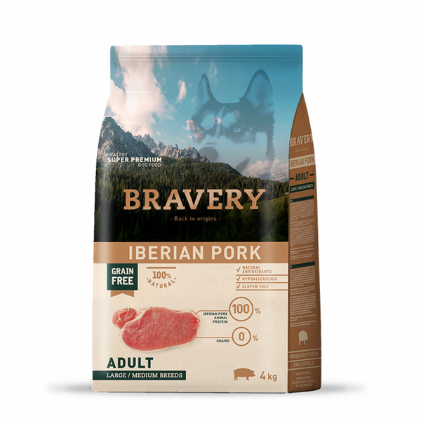 Пълноценна супер премиум храна за израснали кучета от средни и едри породи с иберийско свинско.   Bravery е изцяло натурална храна. Няма добавени изкуствени оцветители, подсладители или консерванти! Поради отсъствието на каквито и да е зърнени култури и наличието на единствен първокласен протеин от иберийско свинско, храната е хипоалергенна. Благодарение на балансираните си натурални съставки, Bravery осигурява идеална грижа и цялостно укрепване на тялото.       Подкрепа на имунната система: MOS + ß-Глюкани Комбинираното действие на MOS и β-глюкани значително стимулира имунната система.     Сърдечно-съдово здраве: Ω (EPA + DHA) + Таурин Тауринът е полезен за предотвратяването на някои кардиомиопатии, докато Ω-3 мастни киселини (EPA и DHA) спомагат за усилване на сърдечната функция.     Добро зрение: DHA + Таурин Тауринът е аминокиселина, спомагаща за доброто зрение, докато Ω -3 мастни киселини (EPA и DHA) са необходими за здравината на ретината.     Оптимални енергийни нива: L-карнитин L-карнитинът спомага за превръщането на телесните мазнини в мускули и енергия, предотвратявайки натрупването на излишни телесни мазнини и помага за предотвратяване на мускулните увреждания по време на активност.     Грижа за стомашно-чревния тракт: FOS + MOS + естествени фибри Комбинираното действие на FOS като пребиотик, MOS влияещи над контрола на патогенните микроорганизми и естествените фибри (разтворими и неразтворими) подобряват чревната флора и благоприятстват прехода на вещества през тракта.     Грижа за кожата и козината: Ω6 + Ω3 + Биотин Високите нива на биотин (важни за синтеза на кератин), комбинирани с Ω 3 и Ω 6 мастни киселини подобряват здравето на кожата и се грижат за сияйната козина.    Фактор против стареене: SOD (контрол на свободните радикали) + VIT.E + SE Концентриран сок от пъпеши, богат на първични антиоксиданти, комбиниран с витамин Е и селен, образува силен антиоксидантен комплекс, който предотвратява образуването на свободни радикали.     Мозъчно здраве: Ω3 (EPA + DHA) Ω3 мастни киселини (EPA и DHA), подпомагат правилното развитие на нервната система, като допринасят за подобрената оксигенация на мозъка при по-възрастните животни, като същевременно подпомагат способността за учене на младите животни.     Орална грижа: Мента Добрата билка е важна за свежия дъх на нашите любимци!     Контрол на миризмите: YUCCA Юка помага за предпазване на червата и черния дроб от амоняк, като същевременно намалява миризмата на изпражненията.     Грижа за ставите: Глюкозамин+ Хондроитин Хондроитинът и глюкозаминът са основни компоненти на хрущяла, с допълващи се ефекти върху поддържането на доброто състояние на ставите.   Състав: Дехидратирано иберийско свинско месо, тапиока, мазнина от домашни птици (Източник на Ω-6 мастни киселини), грах, мая и екстракт от мая-Saccharomyces cerevisiae (Източник на мананолигозахариди – MOS and β-глюкани), рибено масло (Източник на Ω-3-EPA и DHA мастни киселини), хидролизиран пилешки черен дроб, сладък картоф, рожков, картофен протеин, дехидратирани яйца, захарно червено цвекло, хидролизиран пилешки протеин, инулин (разтворима цикория, източник на фосфоолигозахариди – FOS), естествена целулоза (източник на неразтворими фибри), минерали, разтворими хранителни фибри - ектсракт от Plantago ovata, етерични масла (риган, канела, детелина, мащерка, розмарин, мента, зелен чай), хидролизира