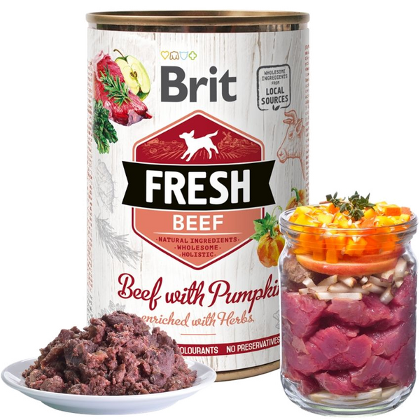 Консервираната храна Brit Fresh осигурява деликатно, балансирано хранене с прясно месо, зеленчуци, плодове и билки от местни био ферми. Месото и зеленчуците се обработват по специален начин, който запазва есествените им вкусовеи качества, сокове и хранителни вещества.