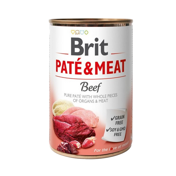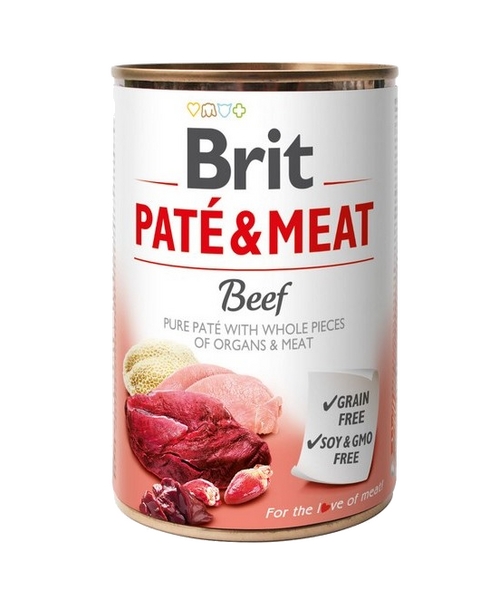 Пълноценна консервирана храна за кучета. Пастет с парченца чисто месо и карантии. Високото съдържание на качествено месо и внимателната обработка гарантират отличен вкус и аромат. Вкусна комбинация от истински парченца месо и карантии в пастет, за да задоволи перфектно дори и най-взискателните кучета.    Brit Pâté & Meat е идеална добавка към гранули. Спомага за подобряване на приема на храна и хидратация.   БЕЗ ЗЪРНО / БЕЗ СОЯ / БЕЗ ГМО   Състав: 55% говеждо месо (месо и органи) 15% пуйка (месо и органи) 3% грахово нишесте 1% грахово влакно 0,5% масло от сьомга Аналитични съставки: суров протеин 9% сурова мазнина 8% сурова пепел 2,5% влага 78% сурови влакна 0,5% калций 0,1% фосфор 0,3% натрий 0,2% Хранителен състав: витамин D3 (3a671) 250 IU витамин Е (3a700) 100 mg цинк (3b606) 15 mg желязо (3b106) 10 mg манган (3b504) 3 mg калиев йод (3b201) 0,75 mg мед (3b406) 0,5 mg биотин (3a880) 0,2 mg Технологични добавки на 1 кг: гума от рожков (E410): 5000 mg.   Метаболизируема енергия: 1,143 kcal / kg   Да се ​​съхранява на хладно и сухо място. След като се отвори, съхранявайте в хладилника. Срок на годност и партида на дъното на кутията Препоръки за хранене: Килограми на кучето Малки (1-10kg) Средни (10-25kg) Големи (25–45kg) Гиганти (45-90кг) Като основна храна 100-200g 200g-400g 400-800g 800-1200g Като допълваща храна 50:50 (g) 50-100g 100-200g 200-400g 400-600g Винаги подсигурявайте на кучето си достатъчно прясна вода за пиене.