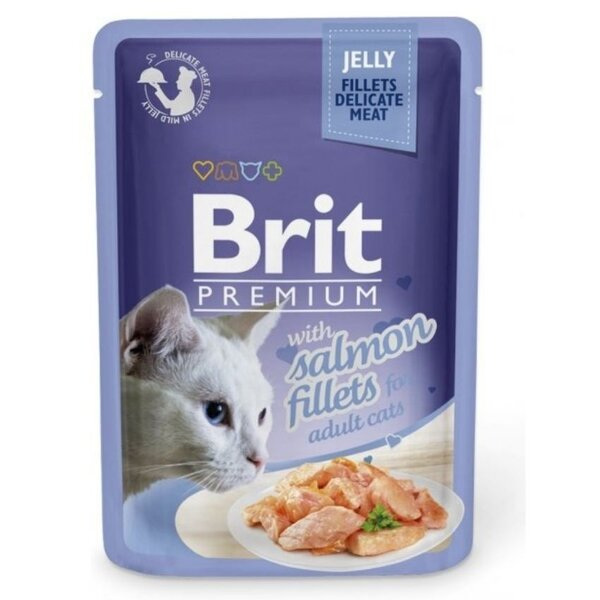 Brit Premium Cat Delicate с парченца сьомга в желе е пълноценна мокра храна за възрастни котки.