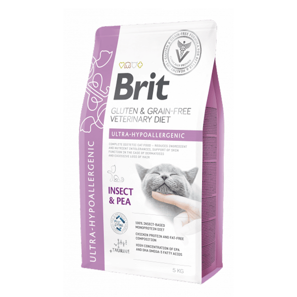 Brit GF Veterinary Diets Cat Ultra-Hypoallergenic е специално разработена пълноценна и балансирана храна за котки, които имат хранителна непоносимост или алергии към определени съставки. Тази храна е предназначена да се използва като диета, която намалява риска от алергични реакции. Основната характеристика на тази храна е използването на протеин от насекоми като източник на протеини. Насекомите са изключително рядко срещани в храната за котки и се смята, че са хипоалергенни. Това означава, че храната е много малко вероятно да предизвика алергични реакции или хранителна непоносимост при котките.