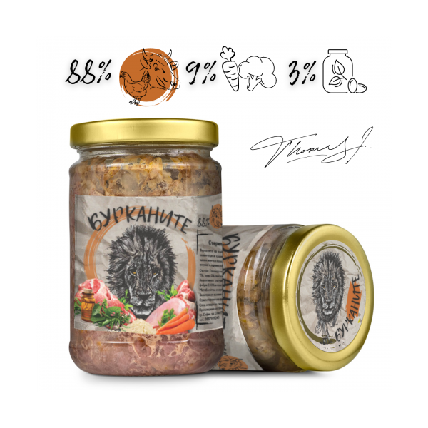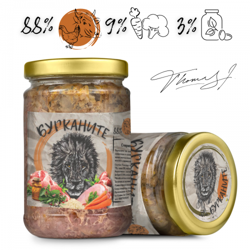 Открийте "Бурканите" – пълноценна и 100% натурална храна за котки, приготвена с любов и грижа. Всяка порция е сготвена директно в буркана чрез стерилизация, метод, който запазва всички ценни хранителни вещества, витамини и неустоимия вкус на истинското месо.