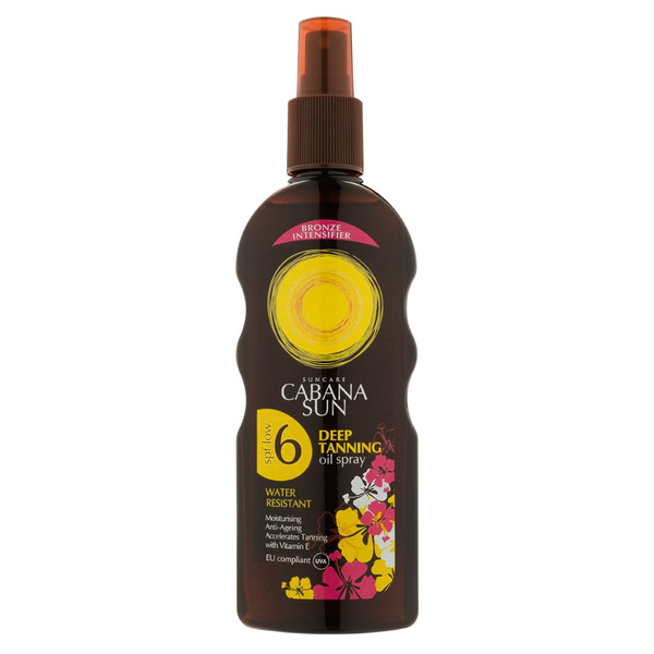CABANA СЛЪНЦЕЗАЩИТНО ОЛИО ЗА ИНТЕНЗИВЕН ТЕНSPF 6 НИСКА ЗАЩИТАСпециално създаден, за да придаде плътен, дълбок и траен тен. Обогатен с масло от кокос и витамин E. Съдържа тирозин за стимулиране и подсилване на естествения тен.Употреба : Продуктът се нанася обилно (около 35 гр. за средностатистически възрастен човек или не по-малко от 6 пълни чаени лъжици) поне 20 мин. преди излагане на слънце. За поддържане на защитата трябва да се нанася отново и многократно след изпотяване, плуване или избърсване. Предупреждение:Намаляването на количеството значително понижава нивото на защита. Продуктът не защитава 100%. Не се излагайте прекалено дълго на слънце дори когато употребявате слънцезащитни продукти. Избягвайте да се излагате на слънце между 11:00 и 15:00 часа. Не излагайте бебетата и малките деца на директна слънчева светлина. Прекомерното излагане на слънце представлява сериозна заплаха за здраветоВнимание : Само за външна употреба. Избягвайте контакт с очите. Пазете далеч от деца. Прекратете употребата на продукта в случай, че се появи дразнене на кожатa