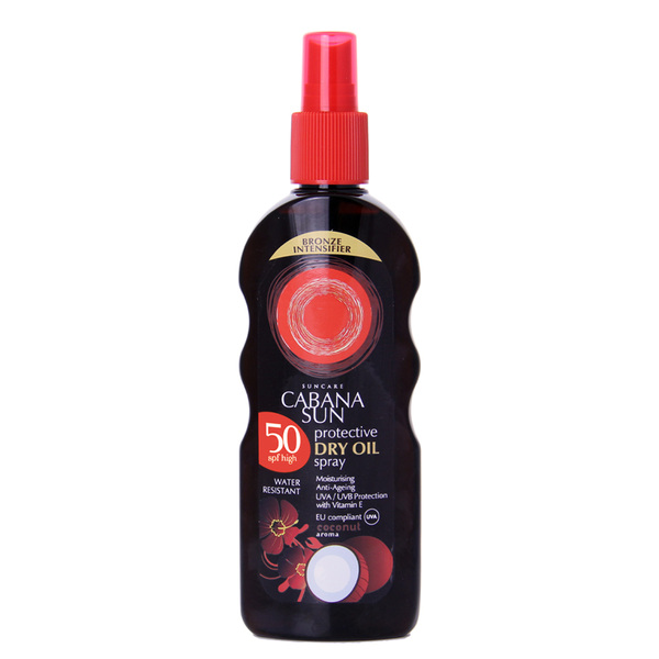 CABANA СЛЪНЦЕЗАЩИТНО СУХО ОЛИО СПРЕЙ SPF 50 ВИСОКА ЗАЩИТА За цялостна защита на тялото и скалпа. Предпазва от вредните UVA и UVB лъчи. Не оставя бели следи и не омазнява. Съдържа тирозин за стимулиране и подсилване на естествения тен.Употреба : Продуктът се нанася обилно (около 35 гр. за средностатистически възрастен човек или не по-малко от 6 пълни чаени лъжици) поне 20 мин. преди излагане на слънце. За поддържане на защитата трябва да се нанася отново и многократно след изпотяване, плуване или избърсване. Предупреждение:Намаляването на количеството значително понижава нивото на защита. Продуктът не защитава 100%. Не се излагайте прекалено дълго на слънце дори когато употребявате слънцезащитни продукти. Избягвайте да се излагате на слънце между 11:00 и 15:00 часа. Не излагайте бебетата и малките деца на директна слънчева светлина. Прекомерното излагане на слънце представлява сериозна заплаха за здраветоВнимание : Само за външна употреба. Избягвайте контакт с очите. Пазете далеч от деца. Прекратете употребата на продукта в случай, че се появи дразнене на кожатa