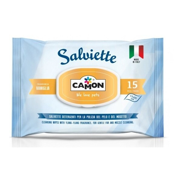 Кърпички за почистване на козина с аромат на ванилия.Много удобни почистващи кърпички за вашия домашен любимец: дръжте ги винаги под ръка у дома или по време на пътуване, за да премахнете всяка лоша миризма и да почистите козината, лапите, муцуната или ушите им.Освежава, подхранва и предпазва деликатно козината на домашния любимец.- без алкохол- без парабениКоличество: 15 бр.Размер на кърпичките: 17x20cm