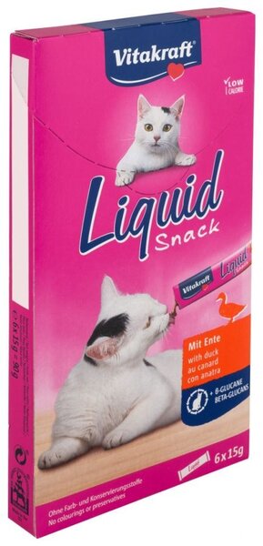 Рецепта без захар. Течен снакс за коте с патешко месо и β-глюкан е меко и приятно удоволствие, което всички котки обожават. За усилване на имунитета. Ниско калорична храна, без изкуствени оцветители и консерванти и без добавена захар. 6бр. в опаковка.