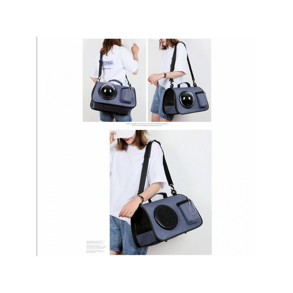 Практична чанта за пренасяне на домашни любимци.Прозорчето позволява на вашият любимец да вижда всичко навън , и така животното се чуства по - спокойно и комфортно.Може да смените прозорчето с другата решетъчна приставка, или да я оставите изцяло отворена! Има и удобна торбичка в която можете да слагате лакомства , вода или санитарните принадлежности на любимеца си. Чантата е изработена от висококачествена ABS пластмаса , която е еластична и има висока устойчивост на удар. Облицована е с висококачествен Оксфордски плат , който е гъвкав и водоустойчив. С каишка за носене на рамо -сглобява се лесно и бързо - не заема място!