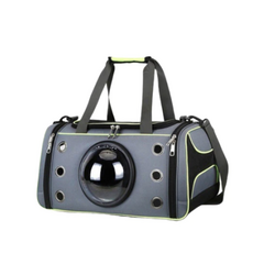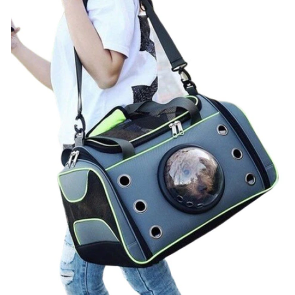 Чанта за различни видове кучета, котки и други домашни любимци за носене през рамо.Изключително стилна и ефектна чанта с горен основен отвор и два странични , проветрение в предната и задна част. Три варианта на прозорец , в зависимост от животното и времето навън. Може се ползва със стъклен сферичен люк тип Скафандър, пластмасова мрежеста решетка или напълно отворена.