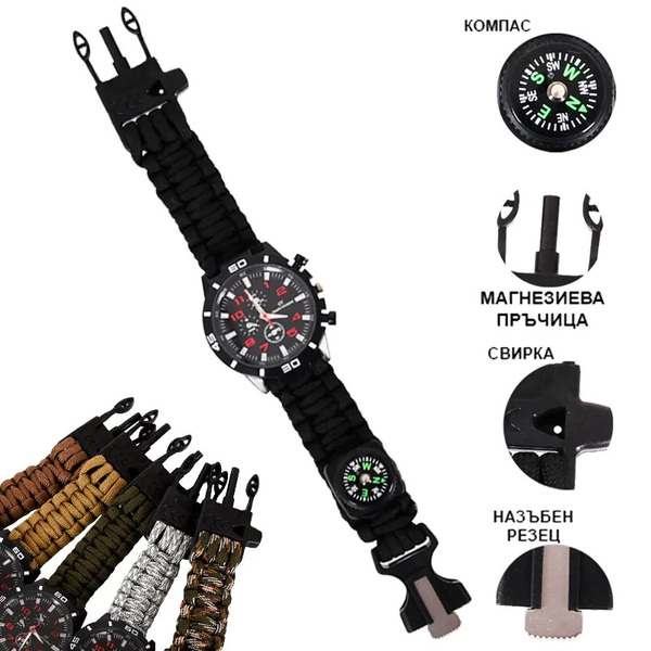 Часовник - гривна за оцеляване 5 в 1 от паракорд - назъбено ножче, огниво /магнезий/, въже паракорд /парашутно въже около 3,5 м. - разпънато/, свирка и компас. Гривната може да бъде разглобена като шнур за направа на капани, изграждане на палатки и в много други непредвидени ситуации.