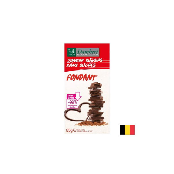 Zonder Suikers sans sucres Chocoladetablet Fondant / Черен шоколад (без захар), с ниско съдържание на въглехидрати, 85 грама е здравословен продукт, произведен от белгийската компания Damhert. Този изискан черен шоколад без захар е предназначен за всички ценители на висококачествените шоколадови изделия. Този шоколад се отличава с минимално съдържание на какао от 45,9%, което гарантира наситен и плътен вкус.