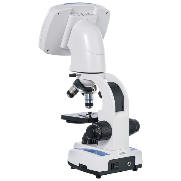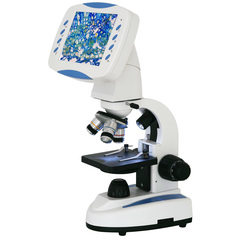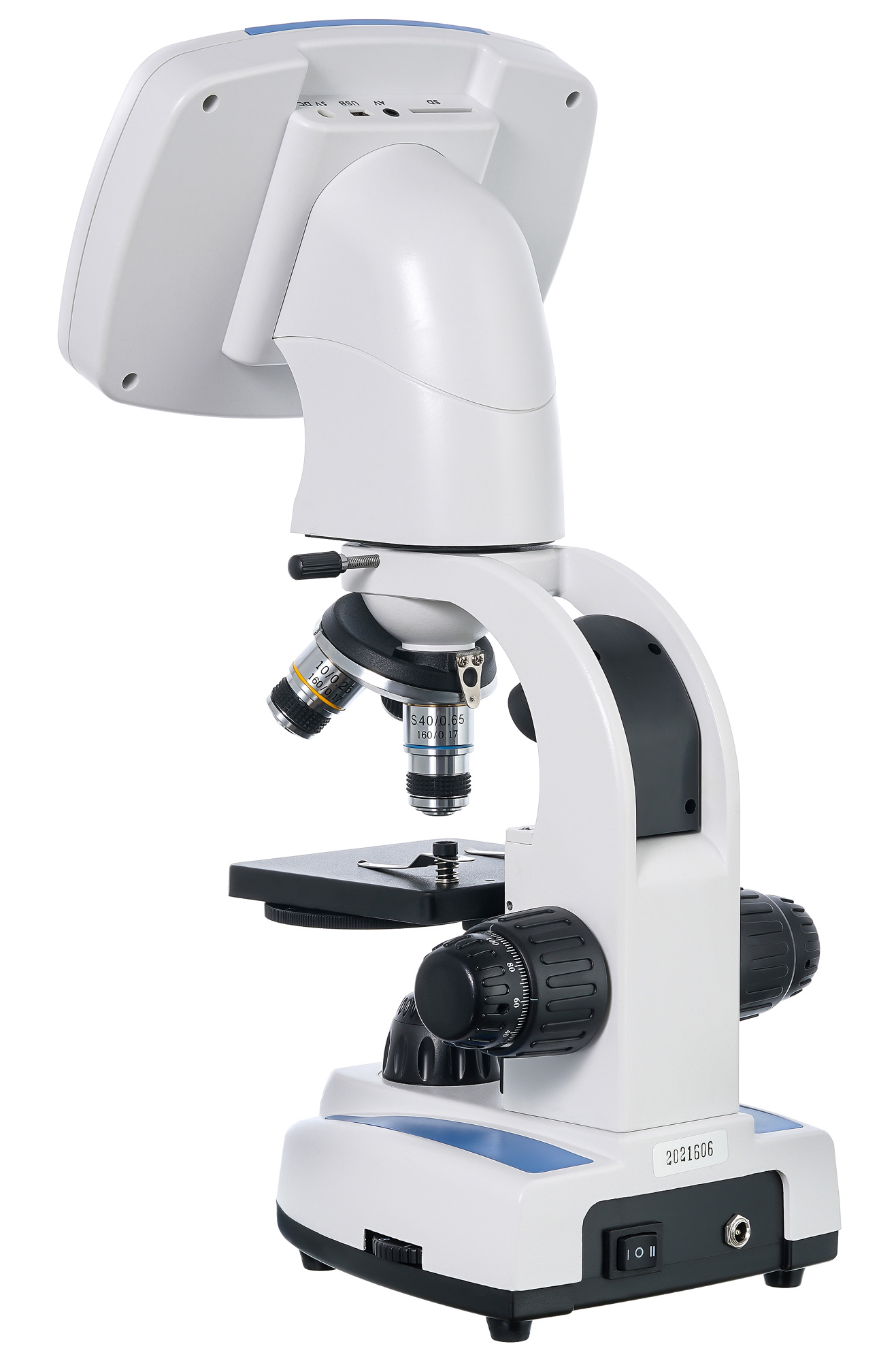 Вместо стандартна окулярна тръба има глава с екран. Това е по-удобна опция за продължителни наблюдения, понеже тя намалява натоварването на очите, както и напрежението в мускулите на раменния пояс. Микроскопите с екран с течнокристален дисплей са подходящи както за домашна употреба, така и за лабораторни проучвания. До екрана има бутони за управление на цифровата камера, а на гърба има слотове за поставяне на карта памет, свързване на захранващ източник и други устройства.