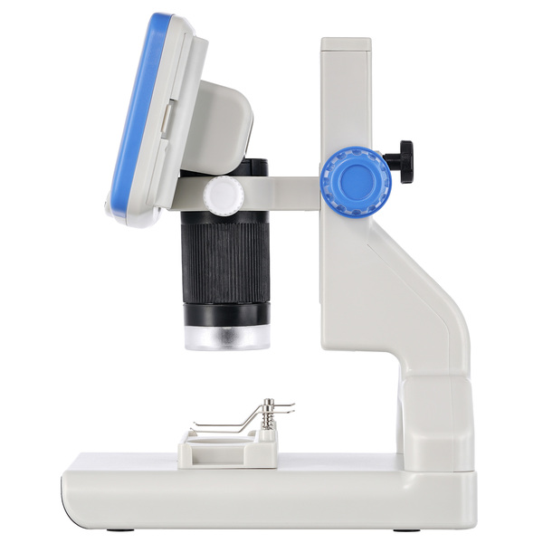 <p>Микроскопът е оборудван с въртящ се 5-инчов цветен екран с течнокристален дисплей. Той може да се накланя на малък ъгъл за удобна работа. Увеличението на микроскопа се променя от 7 до 200 пъти, а оптичното увеличение е в диапазона от 7 до 50 пъти. Предметната маса на микроскопа е оборудвана с щипки за микроскопски проби. От двете страни на предметната маса има светодиодно осветление, така че можете да работите не само с непрозрачни, но и с полупрозрачни и напълно прозрачни образци. Яркостта на осветлението е регулируема.</p>