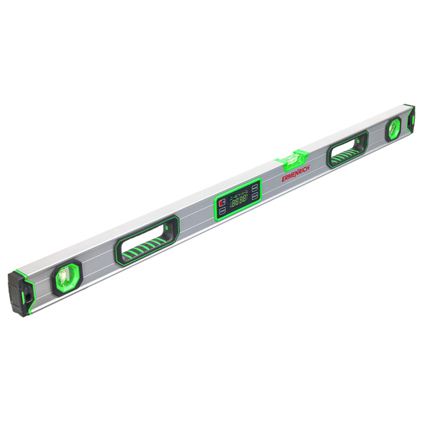 </ul><table><tbody><tr><td>Марка</td><td>Ermenrich</td></tr><tr><td>Гаранция</td><td>5 лет</td></tr><tr><td>EAN</td><td>5905555021393</td></tr><tr><td>Размер на опаковката (Д x Ш x В)</td><td>5x105x8 cm</td></tr><tr><td>Транспортно тегло</td><td>1.365 kg</td></tr><tr><td>Точност</td><td>±0,1° при 0° и 90°, за останалите – ±0,2°</td></tr><tr><td>Измервателен диапазон, m</td><td>0 — 360</td></tr><tr><td>Максимална резолюция</td><td>0,05°</td></tr><tr><td>Функция задържане</td><td>yes</td></tr><tr><td>Функция за нулиране </td><td>yes</td></tr><tr><td>Магнитна основа </td><td>yes</td></tr><tr><td>V-образен канал</td><td>yes</td></tr><tr><td>Визуален локализатор на неизправности (VFL)</td><td>yes</td></tr><tr><td>Диапазон на работната температура,°C</td><td>0 — 40</td></tr><tr><td>Дължина, mm</td><td>1000</td></tr><tr><td>Нивелир тип</td><td>цифров, с мехурче </td></tr><tr><td>Измервателни единици</td><td>mm, m, ft, in, градуси, проценти</td></tr><tr><td>Течнокристален дисплей</td><td>да</td></tr><tr><td>Калибриране</td><td>ръчно</td></tr><tr><td>Захранване</td><td>2 батерии ААА, 1,5 V (не са включени)</td></tr><tr><td>Автоматично изключване на захранването</td><td>3 мин</td></tr><tr><td>Клас IP на защита от вода и прах</td><td>IP54, частична защита от прах, защита от пръски</td></tr><tr><td>Тяло</td><td>алуминий, термопластична гума</td></tr><tr><td>Допълнително</td><td>звукова аларма със зумер , вграден нивелир с мехурче – 3 бр.</td></tr></tbody></table>