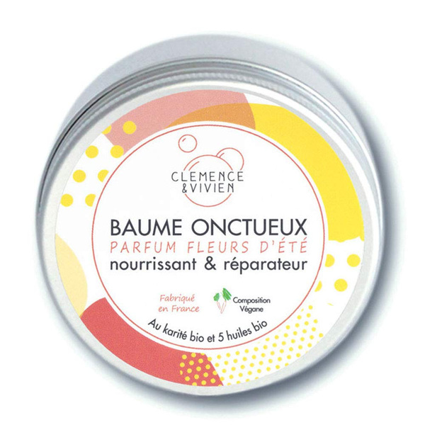 Подхранващ и защитен натурален балсам с масло от карите, слънчоглед и шафранCLEMENCE ET VIVIEN Baume Fleurs d’été е ултра подхранващ балсам за тяло с 5 био масла, включително масло от карите, слънчоглед и шафран. Този натурален продукт защитава, регенерира и омекотява сухата и чувствителна кожа, като осигурява дълготрайна мекота и комфорт. Балсамът е веган, 100% натурален и подходящ за ежедневна грижа. Металната опаковка запазва качеството и свежестта на аромата.