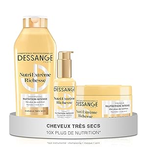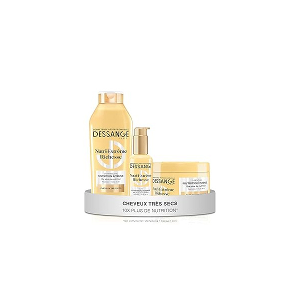 Dessange Nutri-Extreme Комплект за Интензивна Грижа за Суха Коса Интензивна подхранваща рутина за много суха и изтощена коса Dessange Nutri-Extreme комплект е създаден за интензивна грижа за много суха и изтощена коса. Комбинацията от шампоан, маска и серум за коса работи в дълбочина за подхранване и възстановяване на косъма. Съдържание на комплекта: Шампоан 280 мл Маска 280 мл Серум за коса 110 мл Начин на употреба: Измийте косата с шампоан, нанесете маската за 5 минути и изплакнете. Завършете със серума върху дължините и краищата без отмиване