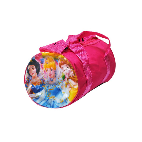 Текстилна чантичка Принцеси с цилиндрична форма с едно отделение, голяма регулируема презрамка и две малки дръжки.