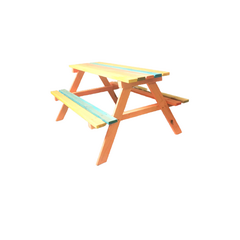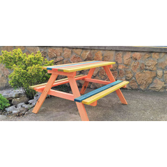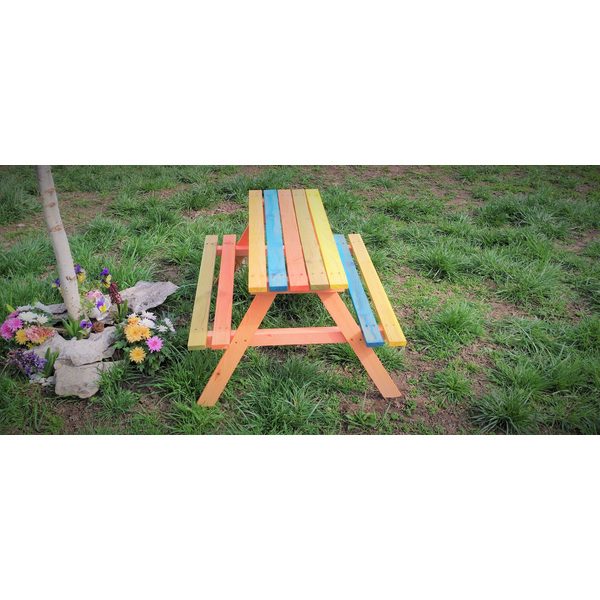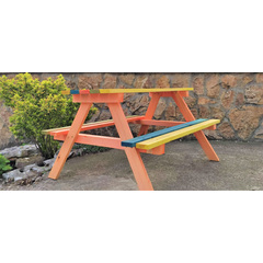 Масата е с неподвижно монтирани пейки от двете страни, подходяща за до четири деца. Възможност за използване на открито и закрито.