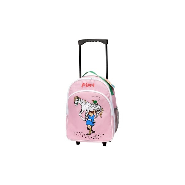 Играйте с най-силното момиче в света! Не е изненадващо, че Пипи е любимец на децата. Историите на Астрид Линдгрен за Пипи Дългото чорапче все още радват децата днес, а класическите илюстрации на Ингрид Ванг Найман ги оживяват. Ще се отправите ли към света, точно като Пипи Дългото чорапче? Това е новата розова раница Пипи на колела, с място за всичко необходимо за приключение! Това е точно подходящата височина за малко човече и ако се умори да го дърпа, възрастен може да го носи като раница с помощта на презрамките. Тази раница разполага с едно голямо отделение и две по-малки, плюс място за изписване на име на гърба.