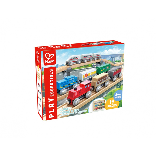 Детски игрален комплект, Hape, Етажерка с дървени влакчета, 19 части