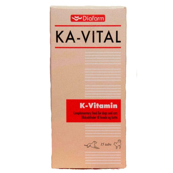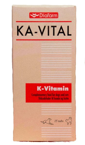 Таблетки с Витамин К 10 mg.Съдържание в табл.:Категория „хранителни добавки”Функционална група „витамини и провитамини”:Vitamin K 10 mg.Функционална група „технологични добавки”Microcrystalline cellulose, PreservativeКомпонентен състав:Dicalciumphosphate, Salts of fatty acidАналитичен състав:Суров протеин: <1%; Сурови влакнини: <1%; Сурови мазнини: <1%; Сурова пепел: 59%.Видове животни, за които е предназначен:Кучета и котки.Показания:Допълваща храна за кучета и котки.Ежедневна добавка от K-витамин. За подпомагане функцията на черния дроб и синтеза на протеини, важни за кръвосъсирването.Дозировка и начин на приложение:Възрастни кучета: 1 таблетка дневно за 10 кг телесно тегло.Кученца: 1 таблетка дневно за 5 кг телесно тегло.Котки: 1 таблетка дневно.Съдържание в една таблетка: Витамин К 10 mg.Опаковка:15 таблетки (блистеровани).