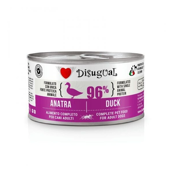 Пълноценна храна за кучета от всякакви породи и размери  Съдържа  96% месо С един източник на животински протеин Без овкусители, оцветители, консерванти и глутен Произведено в Италия Допълнителна информация Тип храна Консерва Състав СЪСТАВ: месо и производни (96% патица), минерали, захари. ДОБАВКИ: Хранителни добавки: Витамин А 5000 IU / kg, Витамин D3 335 IU / kg, Витамин Е 41 mg / kg, Железен карбонат 3,29 mg / kg, Меден сулфат пентахидрат 2,5 mg / kg, Манганов оксид 10,3 mg / kg, Калиев йодид 131 mg / kg, цинков оксид 8 mg / kg, натриев селенит 0,014 mg / kg. АНАЛИТИЧЕН СЪСТАВ: влага 81,8%, суров протеин 8,1%, сурови масла и мазнини 7,0%, сурова пепел 3,2%, сурови фибри 0,2%. Начин на употреба Препоръчителна дневна дажба: Сервирайте със стайна температура. След отваряне съхранявайте продукта в хладилник до 24 часа. Количествата, показани в таблицата, са ориентировъчни. Адаптирайте дневната дажба според реалните нужди на животното.   Тегло на кучето (кг) Количество (гр) 1-5 120-350 10-15 600-850 20-25 1100-1200 30-35 1400-1600 Порода куче Всички Размер куче Много малко, Малко, Средно, Голямо, Гигантско Възраст Зряла възраст